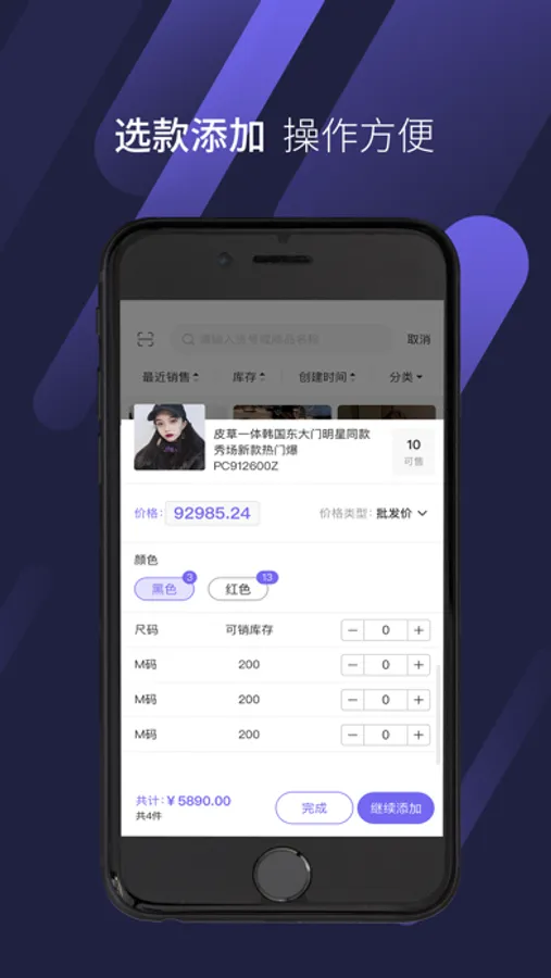 4、灵活的商品规格设置,同时支持颜色、尺码多种规格输入建款,同时自动入库