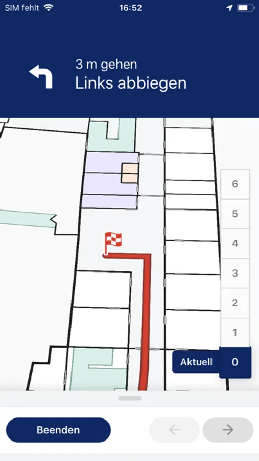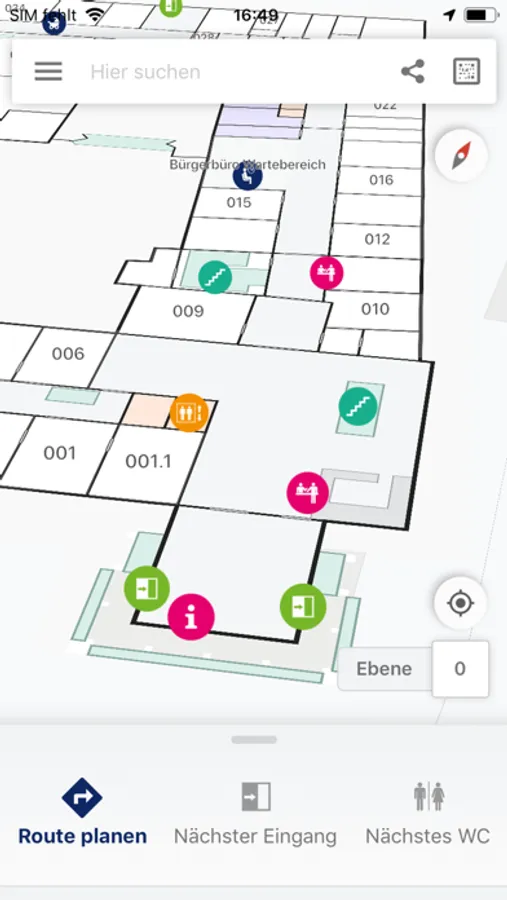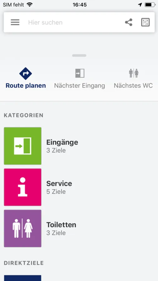 - Ziel suchen: Finden Sie ein Ziel (z.B. WC, Infotheke) direkt über die digitale Karte, das Verzeichnis oder die Freitext-Suche.
