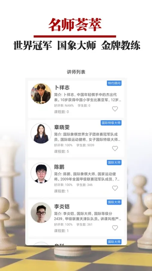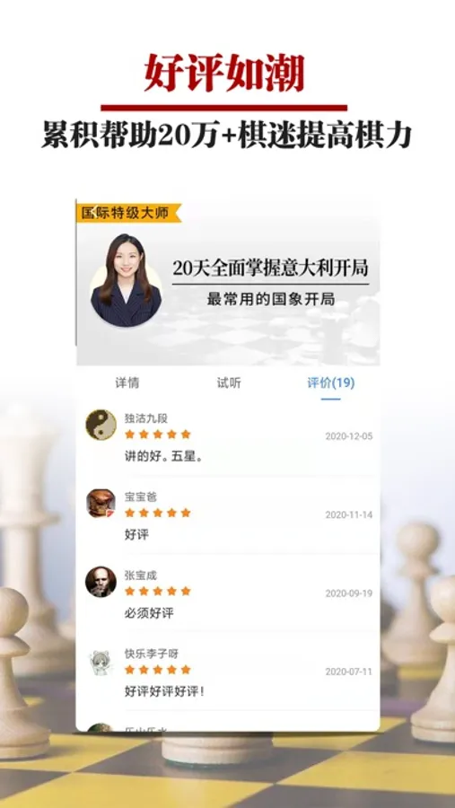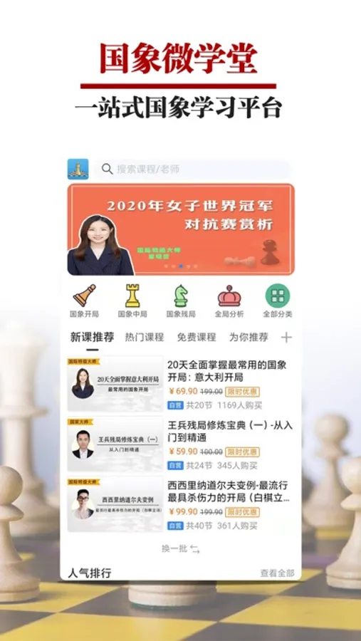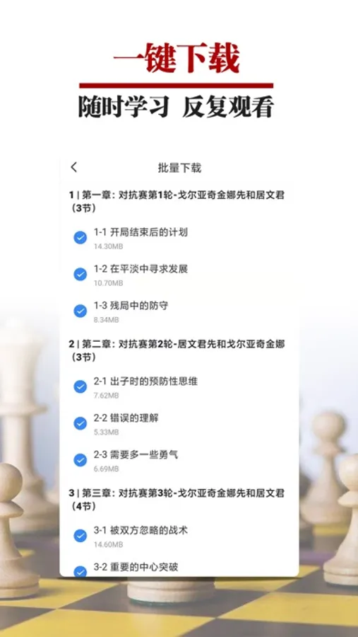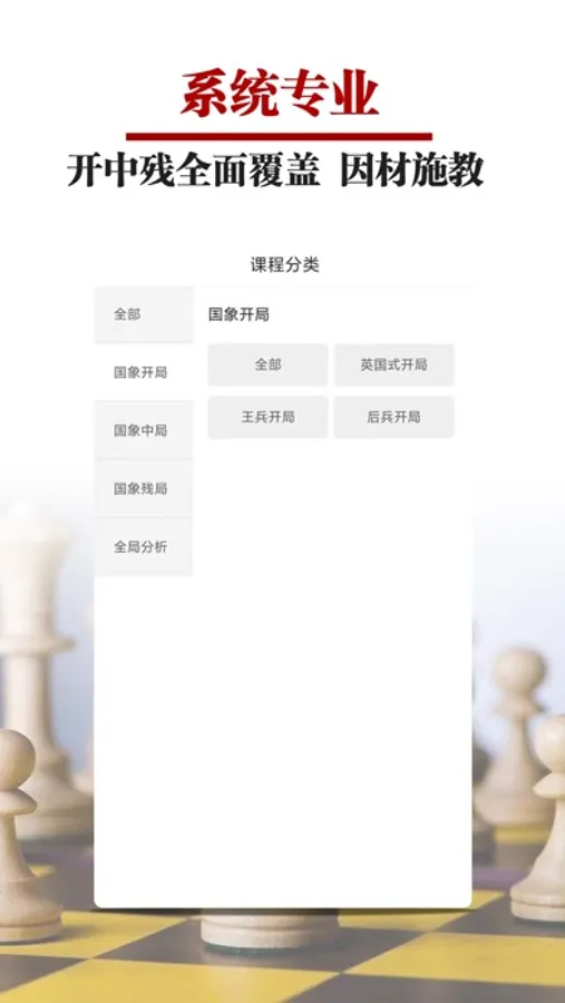 2、实用:针对业余国际象棋爱好者量身定做,根据棋力评测等级选择,因材施教。每节课程20分钟左右,精简干货,适合现代人快节奏学习。