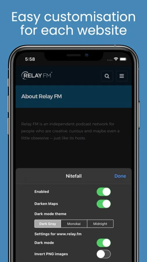 Nitefall is a Safari extension that converts all your websites to dark mode and reduces eye strain, especially helpful at night. It works automatically with system appearance so that your websites are only dark when the whole system is in dark mode.