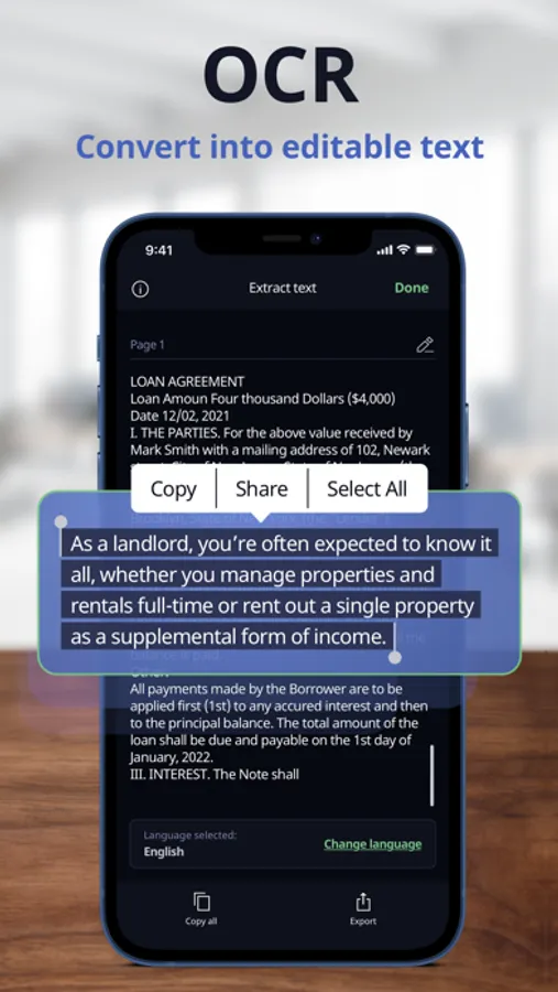 Automatically extract text on PDF documents or pictures and edit it according to your needs. Scan Shot’s OCR (Optical Character Recognition) technology can quickly and accurately convert any document to text with no errors!