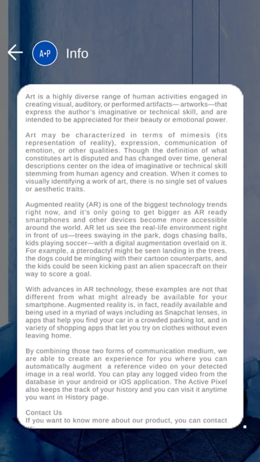 Augmented Video Player for Art Portraits that shows a video on a Photo stored in admin database for information usage.