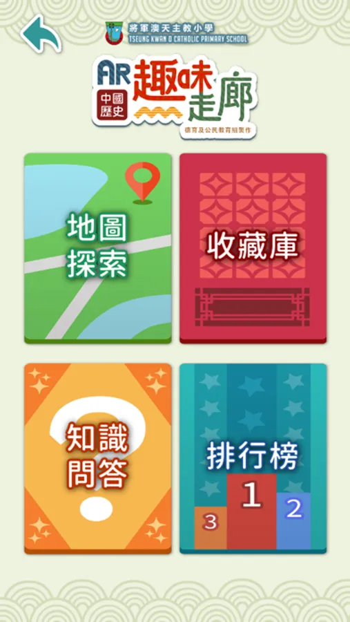 AR趣味走廊是一個運用AR技術學習中國歷史和文化的互動平台。學生們只要簡單掃描地圖上的吉祥物,就能解鎖在收藏庫的寶藏。然而,要得到終極寶物--紀念蓋章,就必須跟時間競賽,根據自己所學的知識完成相對應的問答,並挑戰以最快的答題速度和最高的答題正確率完成測試,贏取精美印章作為紀念。程式更設立排行榜,讓學生可以跟全班甚至全校一較高下,挑戰衛冕榜首。