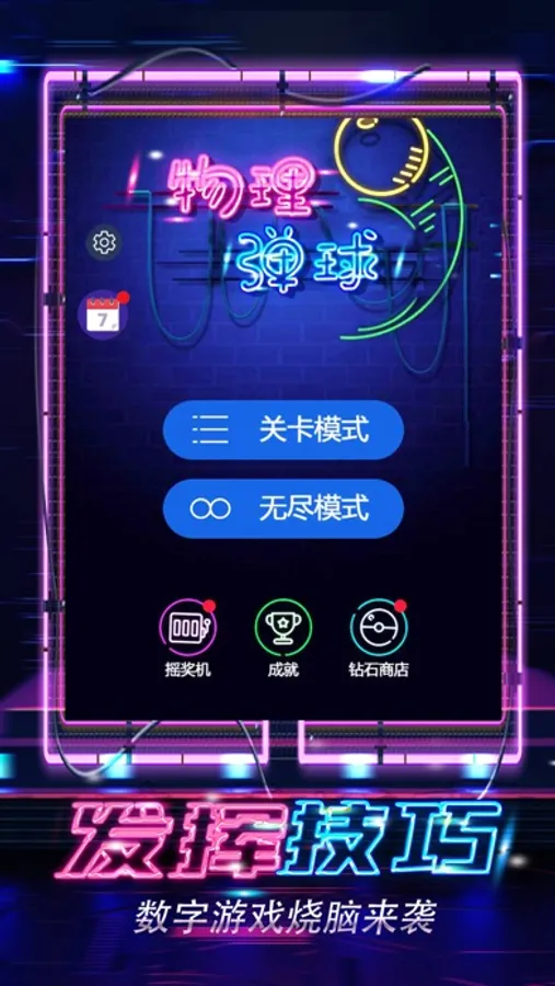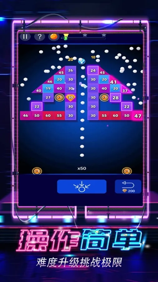 物理弹球是一款弹球消方块的游戏,在游戏中用弹球瞄准方块,将方块全部消除,即可获得奖励,进行下一关游戏。