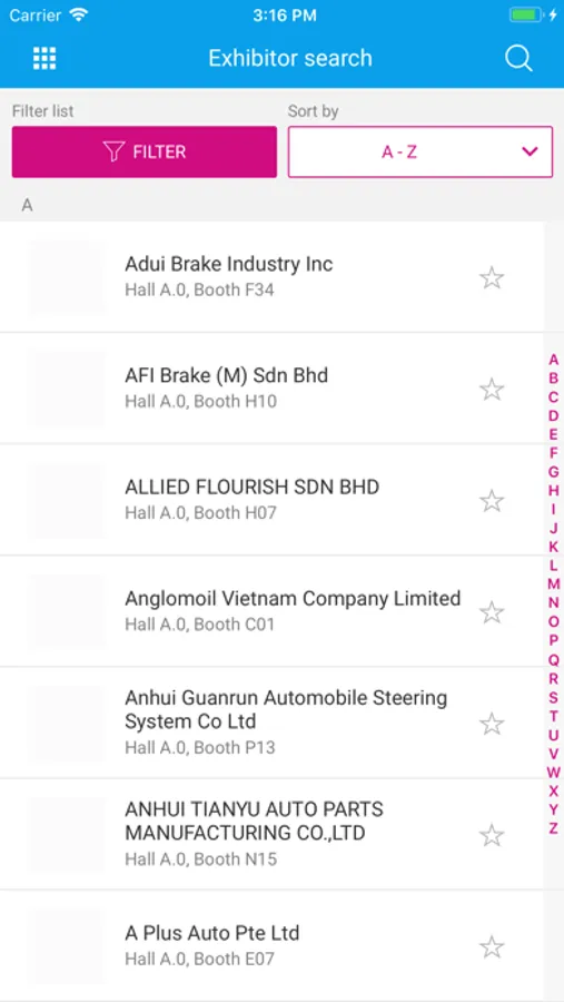 Exhibitors: search for companies and products, filter and sort functions available. Add Photos and Notes to an exhibitor and share them.
