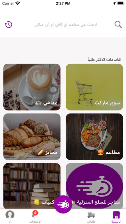 طعام – قهوة – حلا – مستلزمات قرطاسية ومكتبية - خضار – فواكه – لحوم وبقوليات – المخبوزات المشروبات – الالبان والاجبان – العناية الشخصية والعناية بالطفل – العناية بالمنزل – الأجهزة الكهربائية – التسالي – اكل الحيوانات – الصيدلية اختر واطلب ما تحب بكل بساطة، يصل إليك وبدون حد أدنى للطلب.