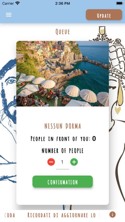 Applicazione per la gestione degli ingressi del locale "Nessun Dorma" a Manarola nelle Cinque Terre. Registrazione utente tramite email o accesso con Google. Inserimento in coda scegliendo il numero di posti, con visualizzazione del numero di tavoli presenti in coda. Ricezione di notifiche push quando sta per arrivare il proprio turno. Pulsante aggiorna per visualizzare la propria posizione nella coda mentre si libera i tavoli nel locale. Comunicazione al locale della propria posizione geografica in modo da poter ricevere notifiche in caso di avvicinamento al locale