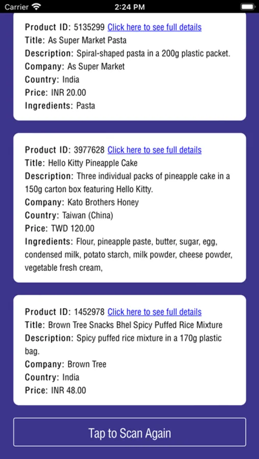 When a product was already inserted by another Network Member, the Scan APP will show details on such product. The Network Member can check the images uploaded and the ingredients, in case for New Packaging and Reformulation.