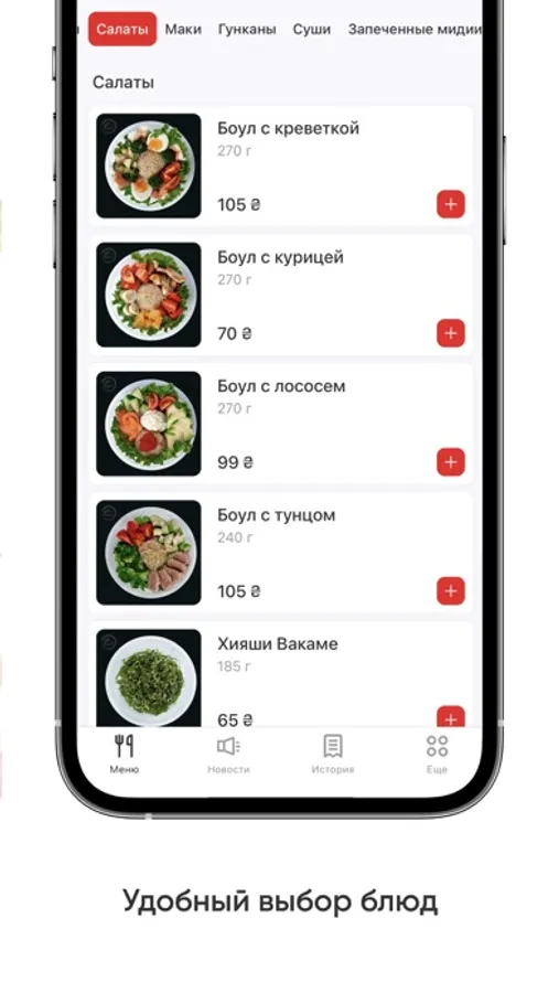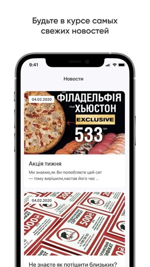 Using the mobile application, you can easily order pizza for every taste and size. Also in our menu you will find sushi, rolls, salads, desserts, hot snacks and more. Sorting by price, detailed descriptions and high-quality photos of dishes available in the application will help you choose exactly what you want.