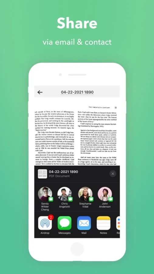 It supports sharing your scanned PDF to people via multiple channels like email, message, WhatsApp, Messenger, and so on.