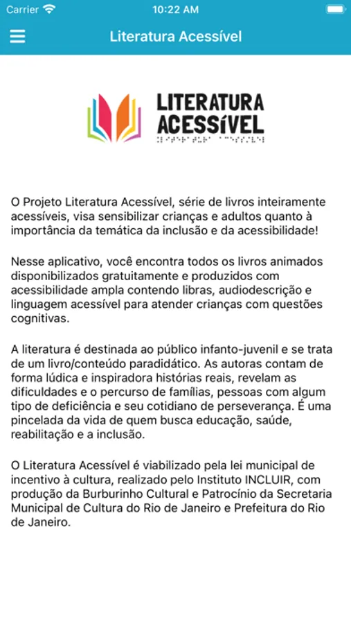 Nesse aplicativo, você encontra todos os livros animados disponibilizados gratuitamente e produzidos com acessibilidade ampla contendo libras, audiodescrição e linguagem acessível para atender crianças com questões cognitivas.