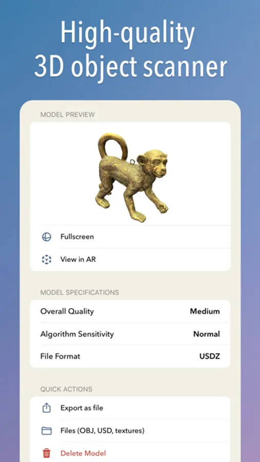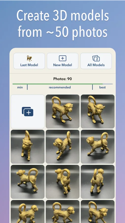 Using Apple's latest advanced Photogrammetry APIs, Modelified allows you to quickly create high-quality 3D models by simply taking photos of your object from all sides.