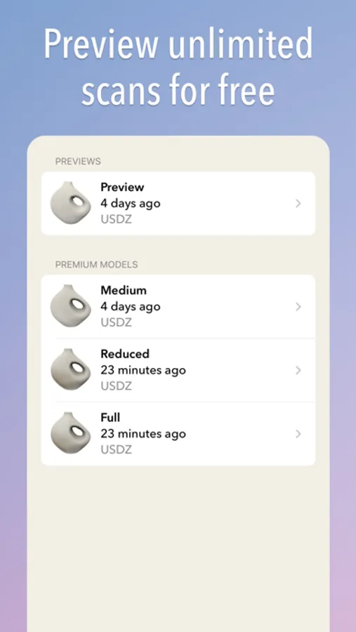 In order to create a 3D model in a higher production-ready quality, you have to unlock each capture for a small fee or subscribe to one of Modelified PRO plans.