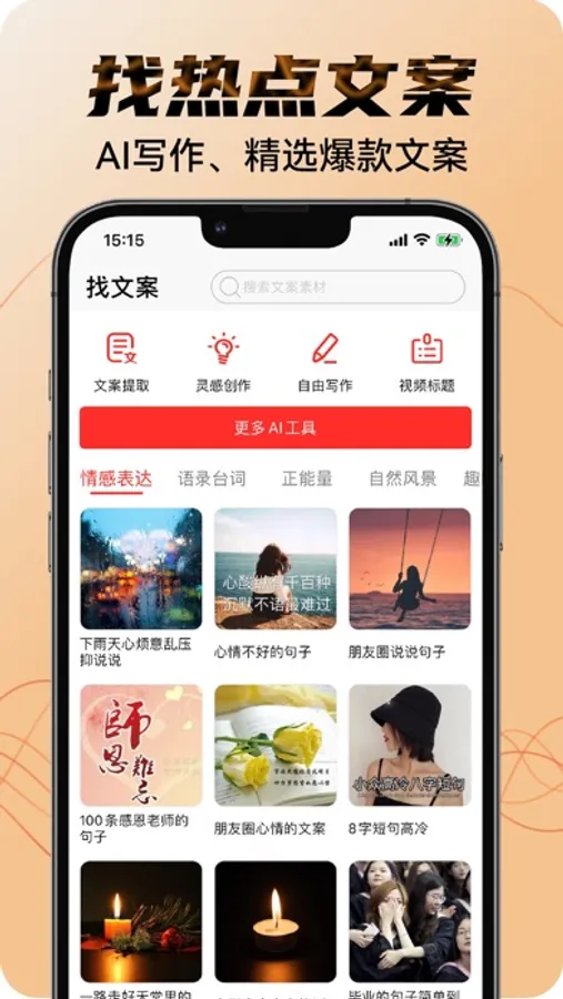 AI智能写作助手为你生成带货文案、视频剧本、探店文案、生活Vlog等,此外还有丰富的文案素材库,包括励志、搞笑、情感、节日祝福等各类文案素材。
