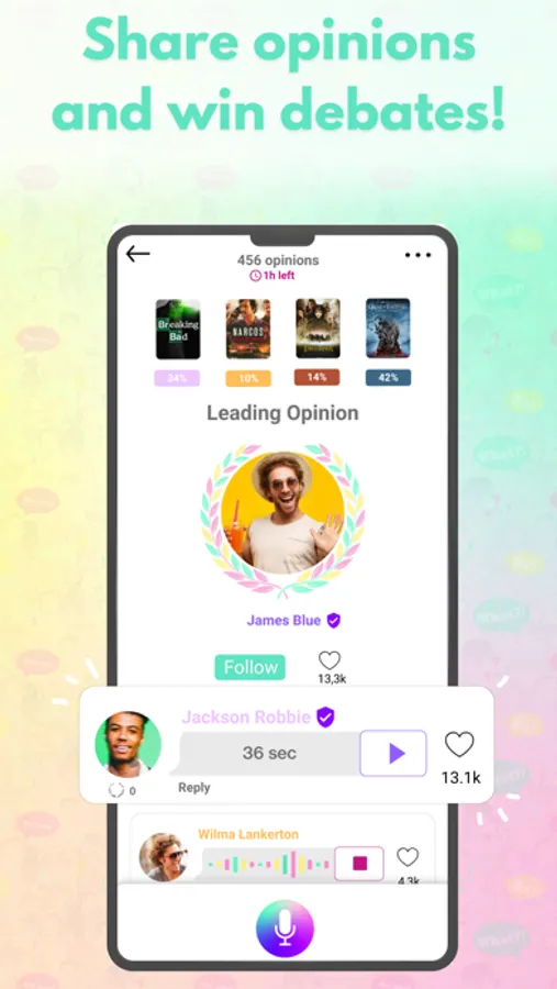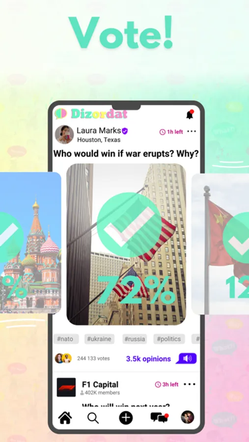 On Dizordat you’ll get to take part in debates on all types of subjects, whether it's with your closest friends or total strangers from all over the world! You can make a poll, post it and get audio opinions on it from all kinds of people!
