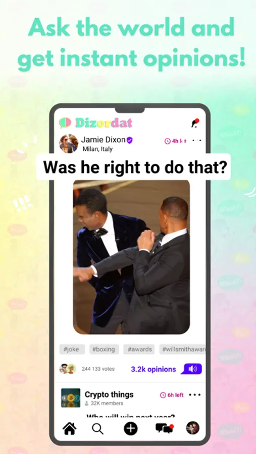 Welcome to the Dizordat community! A social media platform where you can ask questions to your friends or strangers, vote, share opinions in short audio comments, debate, connect and so much more! Here you will find debates and communities on everything!