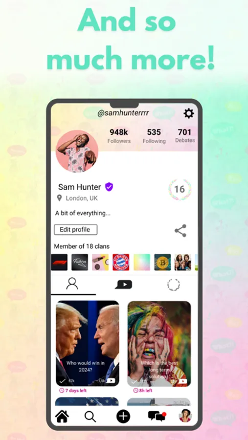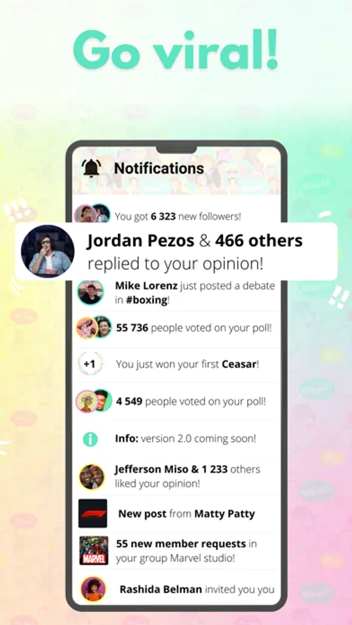 5)GO VIRAL & BUILD YOUR FOLLOWING: Our groundbreaking algorithm allows you to go viral anytime you make a quality poll or you express and discuss well your opinions. Grow the following of your personal profile and of your communities.