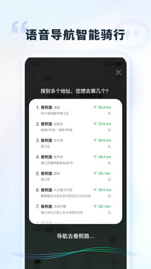 【语音导航】便捷骑行——语音导航。为您的骑行指明方向,发起导航、选择地址列表、结束导航,全程语音操控。