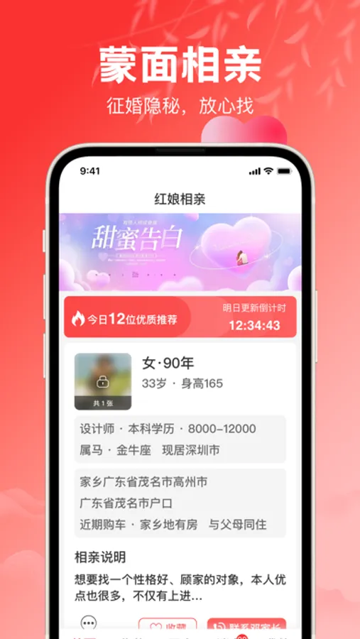 “红娘”是中国专业的相亲平台,全国上百万家长都在使用的真实相亲平台。为您提供征婚交友服务,实现大数据匹配精准推荐;为家长代征提供人性化的简洁界面;为社会和谐贡献绵薄力量。