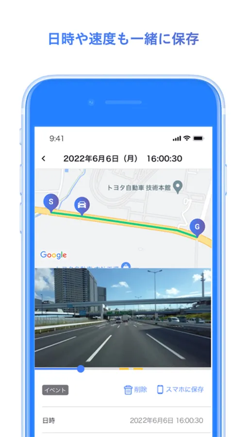 車載ナビとスマホをWi-Fi接続し、ドライブレコーダーで記録された映像をスマホに転送できます。転送した映像は、後で見返した時にわかりやすいように、日時や速度、位置情報も映像と一緒に保存されます。