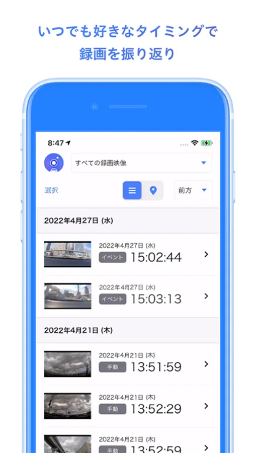 ドライブレコーダーへの記録は『常時録画』、『手動録画』、『イベント録画』、『駐車時イベント録画』に対応し、スマホへの映像転送後、アプリ上の動画一覧でそれぞれの映像種類を確認することが可能です。また、映像再生時にはマップ上でドライブルートを表示させることができるため、どこでいつ撮影された映像なのかを簡単に確認することができます。