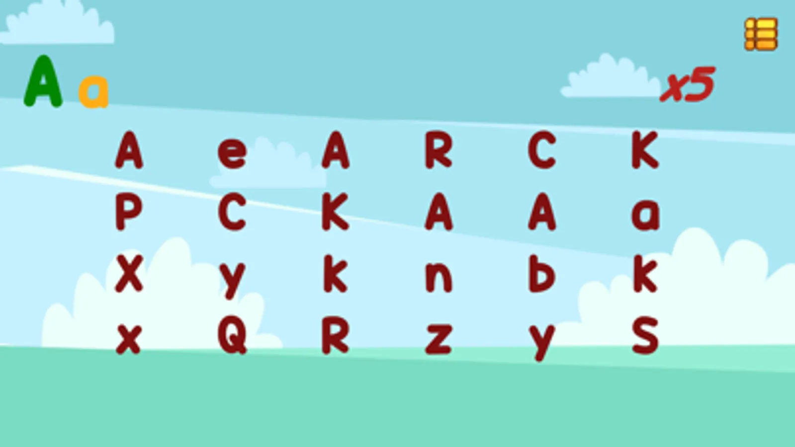 เกมส์หาตัวอักษร ได้พัฒนาขึ้นมาเพื่อเสริมสร้างความรู้ให้ลูกน้อย ได้รู้จักตัวอักษรภาษาอังกฤษ ทั้งตัวพิมพ์เล็ก และ ตัวพิมพ์ใหญ่ และเพื่อให้สามารถแยกแยะตัวอักษรที่กำหนดให้ได้อย่างถูกต้อง