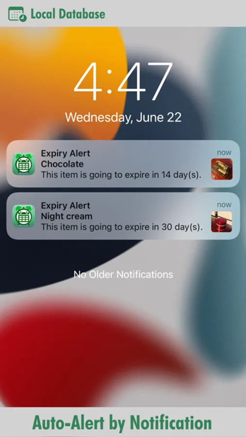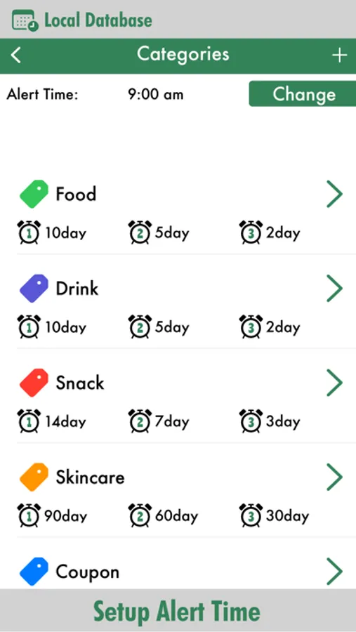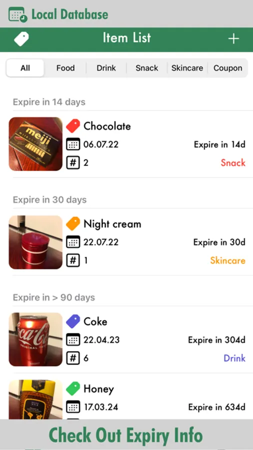 Local Database - Keep track of your items' (e.g. food, drink, coupon) expiry date by categories. Setup 3 alert at designated time before the item expires. Get rid of wastage due to unaware expired items.