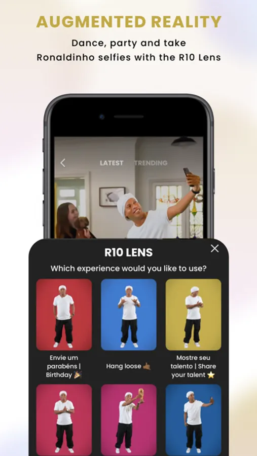 Take Ronaldinho with you, wherever you are, by using the brand-new R10 Lens - his official augmented-reality experience.