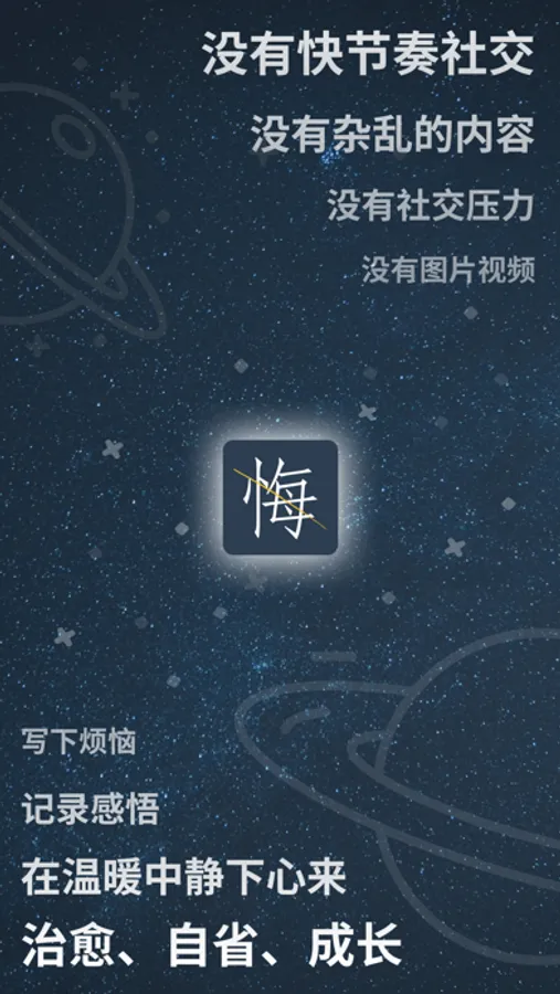 在无悔世界中,每个人的烦恼和感悟都会被发送在这个情绪共鸣的星空之下。阅览他人的烦恼和感悟,领略他人如何抗击烦恼在逆境中进步,枯萎中成长。在这里,你可以传递希望为他人排忧解惑,也可以收获希望,振作向前。要在寥寥的温暖中为自己铸造铠甲,更要在无尽的寒风中为他人燃起篝火