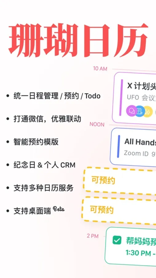 珊瑚日历是新一代 all-in-one 时间管理工具,打通微信,一处管理日历/日程/待办,助你轻松安排工作与生活!