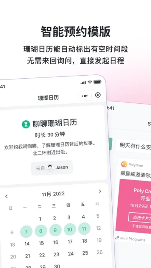- 智能预约模板:珊瑚日历会自动标出你的空闲时间,无需来回询问,让好友直接发起日程