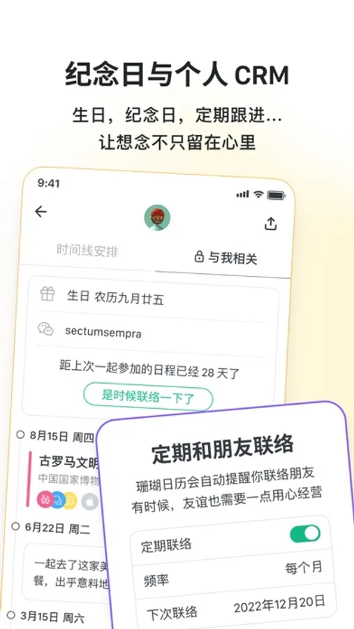 - 纪念日与个人 CRM:朋友生日,美好纪念日,重要客户关系跟进,珊瑚日历帮你记录追踪