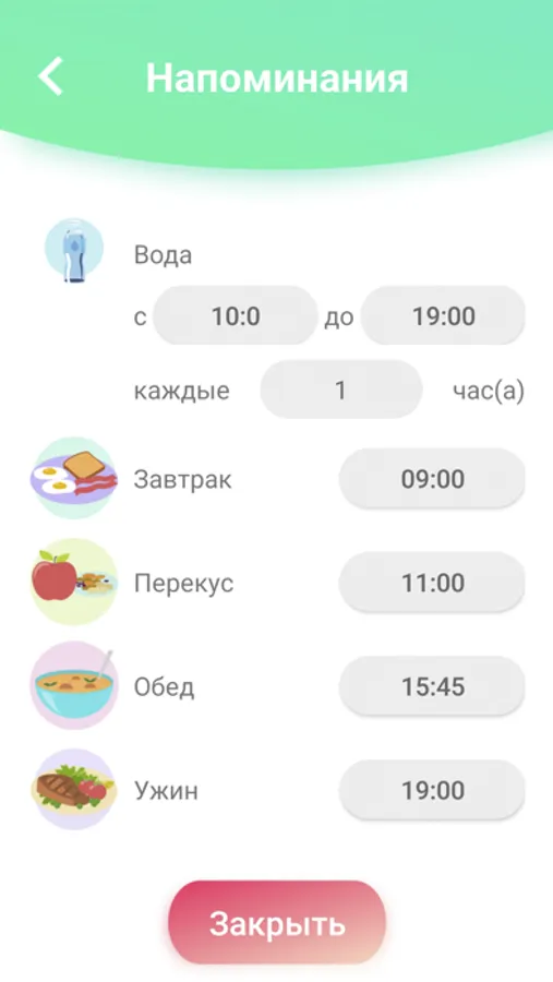 В настройках приложения в любое время можно поменять свои параметры и цели, а также установить суточную норму калорий (ккал) и воды вручную, отключив калькулятор калорий и воды. Если у вас еще нет привычки пить воду в течение дня, то на помощь придет функция «напоминания». Установите необходимый интервал напоминаний и приложение вас оповестит, что пора попить водички. Так вам будет легче сформировать полезную привычку пить воду в течение дня. Так же можно установить напоминания о приеме пищи.