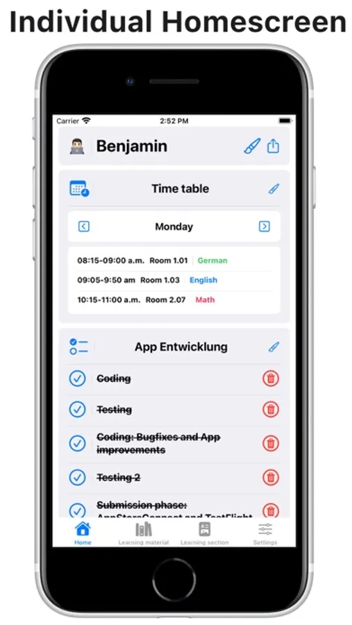 Add a profile banner and up to 10 elements on your homescreen. The following functions are currently available: timetable, to-do lists and the statistics function. Since the latest update, you can also export your start page as a PDF and share it with others in various ways.