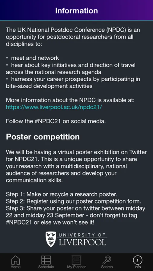 This app is for attendees of the National Postdoc Conference 2021. The App provides a range of features to enhance the attendee’s experience, including the ability to create a personalised itinerary.