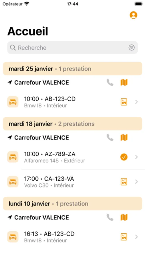 Retrouvez les informations de vos lavages, la marque et modèle de vos véhicules ainsi que les options sélectionnées.