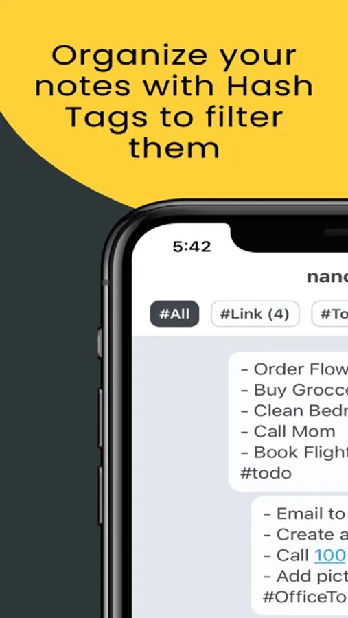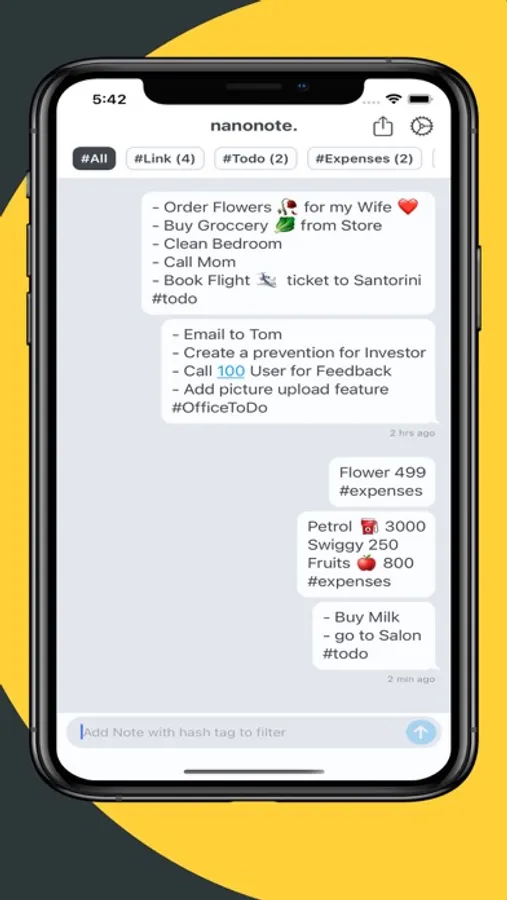 nanonote - Quickest way to take a note of everything in Chat-style. Write freely organise with #tag to filter your note. People are using this for saving links, creating to-do, daily journals, saving expenses and more.