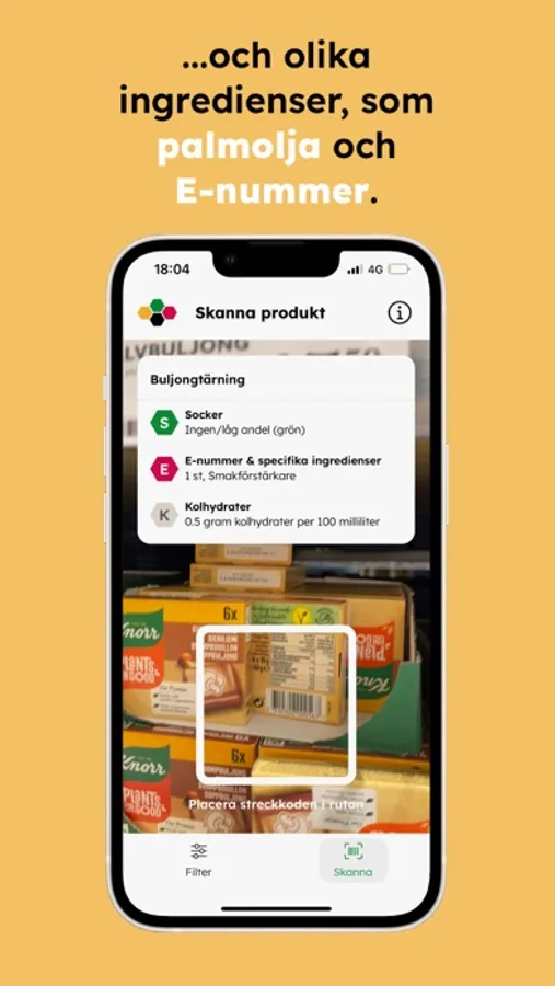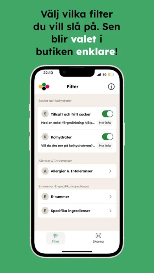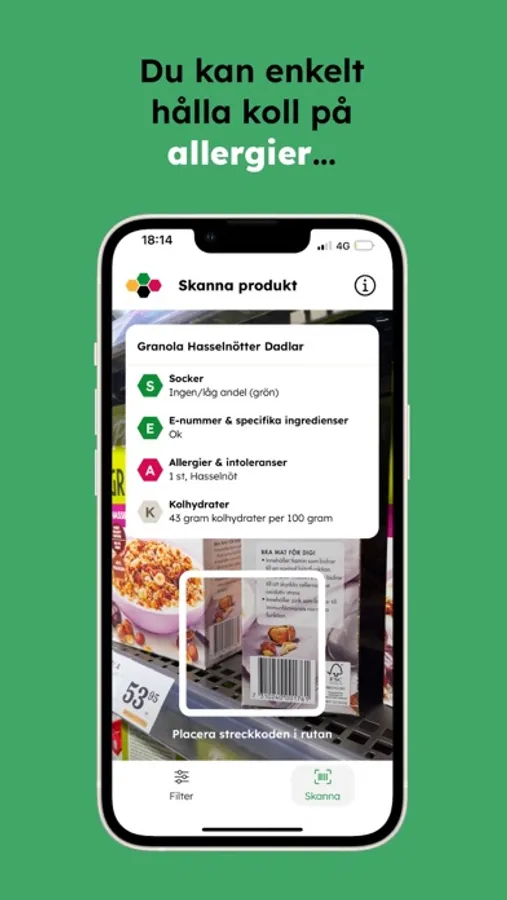 Appen innehåller även filter för exempelvis onaturliga tillsatser, sötningsmedel och nötter. Vill du hålla koll på hur mycket kolhydrater olika varor innehåller, så kan du få hjälp med det också.