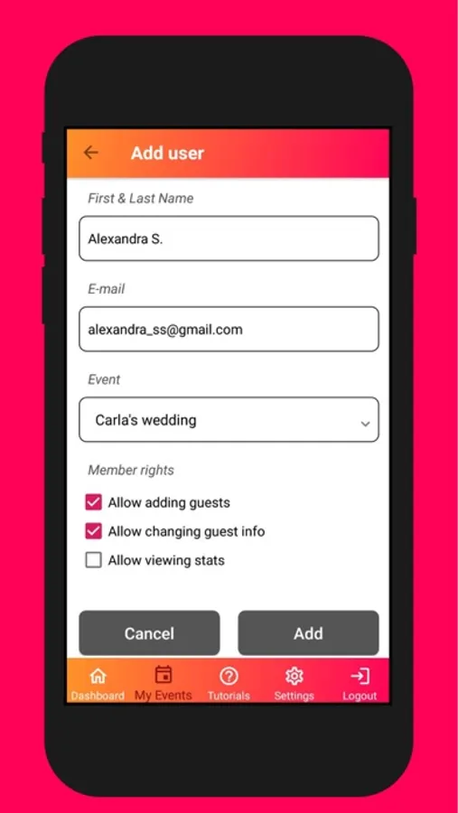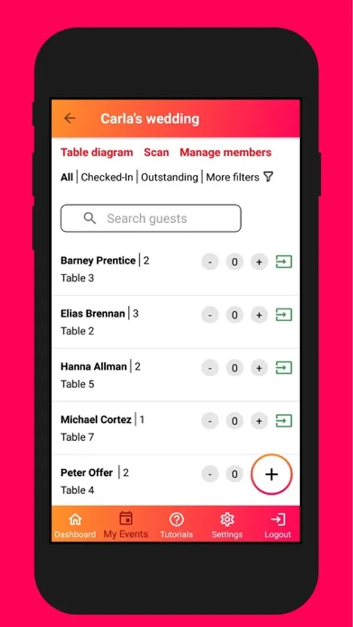 Keep a detailed overview of your guests’ arrivals. See how many guests you and your staff have added, invited, and checked in.
