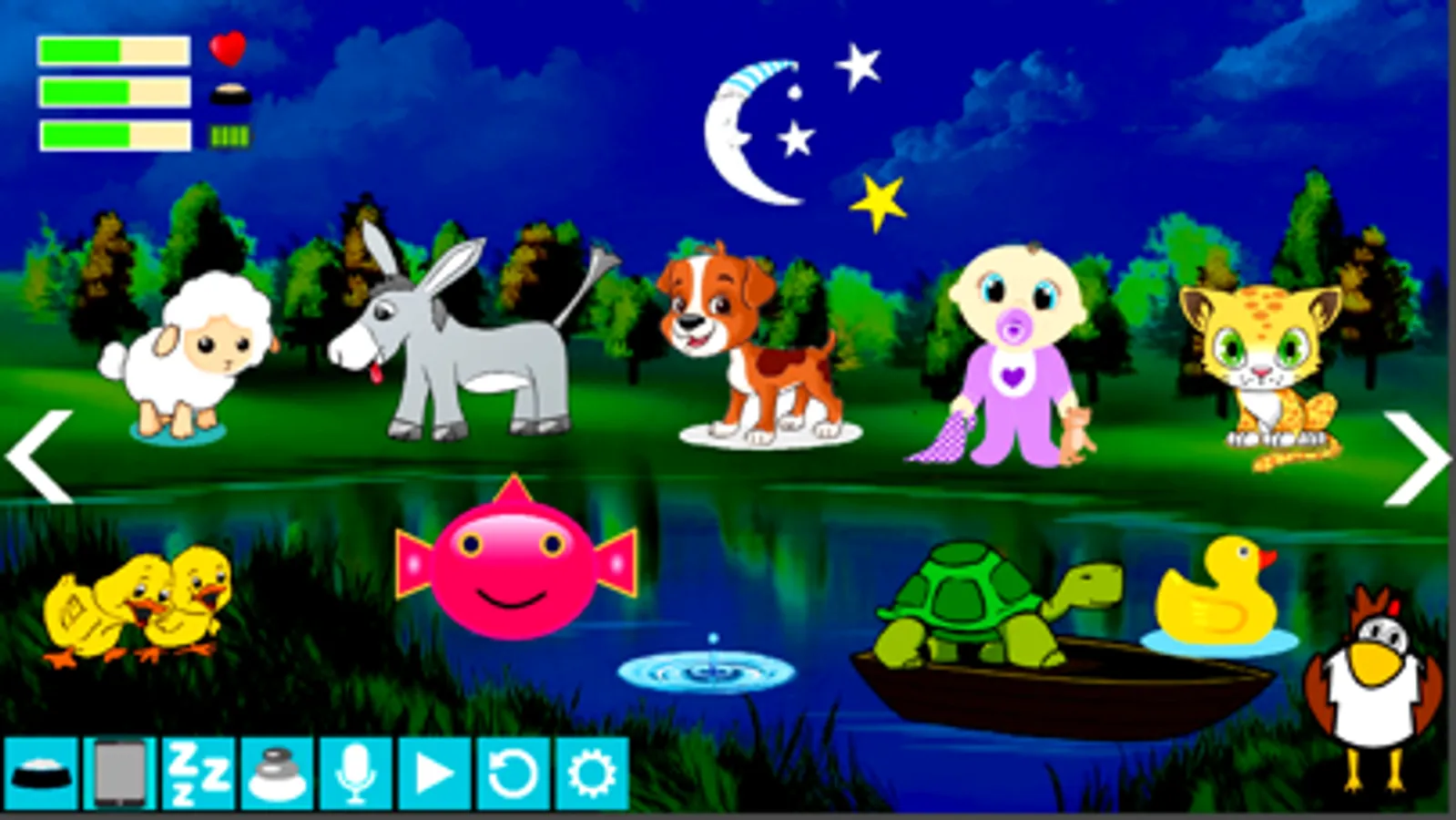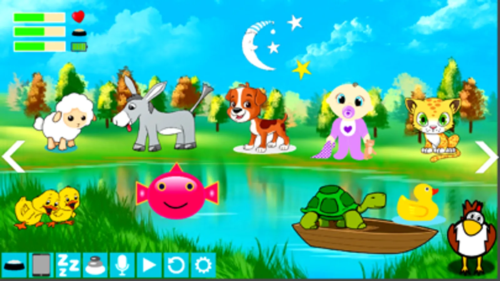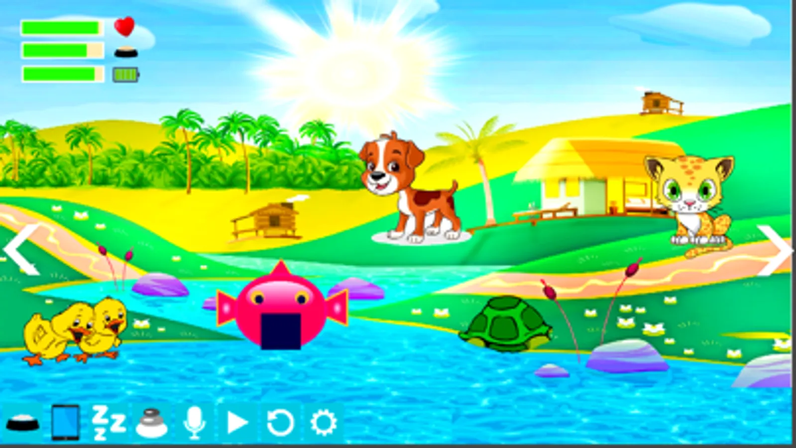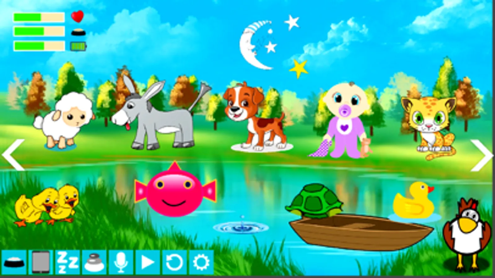 The aim of Virtual Pet - Animal Sounds game is to feed your fish, put it to sleep and play with it and play animal sounds. The app is designed for children and babies. Talk with the fish by pressing microphone button. The app records your voice and the fish repeats what you say. You can apply pitch sound effect and change the voice pitch using the settings button. The fish is living in a lake in a forest. It has animal friends, rooster, dog, cat, sheep, donkey, duck, chick, turtle and a baby. The fish becomes happy when it hears the sounds of other animals and the baby. The fish would like to play with a tablet and listen to music and lullaby. The fish becomes afraid when you throw a stone on the lake. Turtle hides and unhide when you touch it and makes a squeaking sound. The aim of the game is to make the fish happy, full, and full of energy.