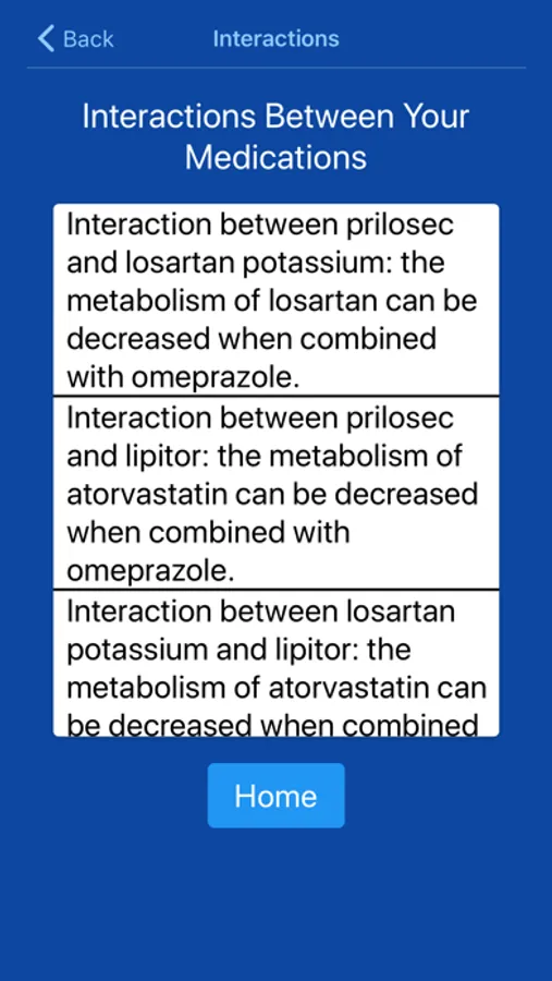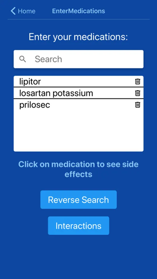 Suppose you are taking multiple medications and are experiencing a health issue such as a headache. With SideEffects2, you can find out which of your medications could be causing that health issue. In addition, you can see all the side effects of a medication, and get the possible interactions between your medications