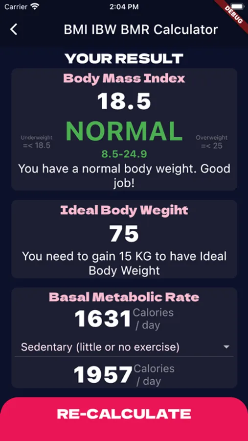 This app helps you to calculate your Body Mass Index, Ideal Body Weight & Basal Metabolic Rate (3 in 1).