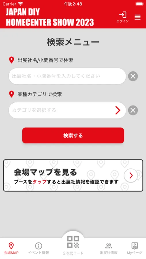 ブースマップの表示の他、マップ場で出展社名で検索するとブースの確認が出来る機能です。