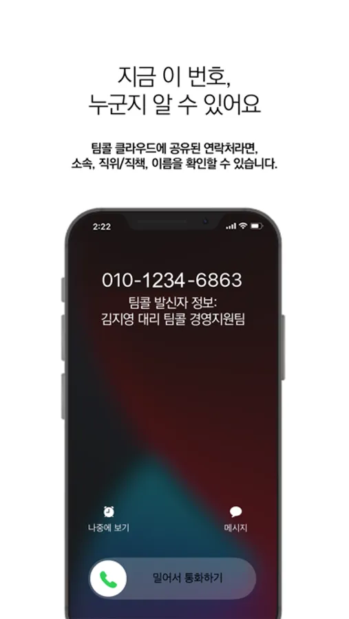 오는 전화에 대해서 팀콜 클라우드에 공유된 연락처라면 소속과 직책/직급, 이름을 확인 할 수 있습니다.