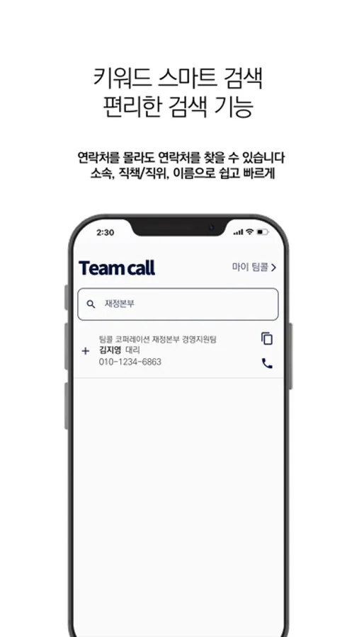 팀콜 클라우드에 공유된 연락처를 빠르고 손쉽게 검색할 수 있습니다. 소속, 이름, 연락처 등의 정보로 팀원을 찾을 수 있습니다.