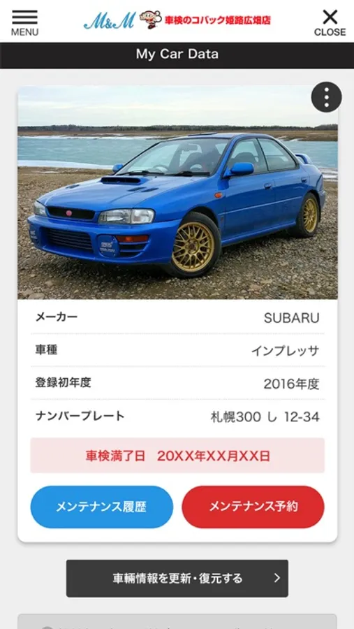一度店舗へご来店いただきお車の登録がある場合、アプリに必要情報を入力していただくと、ご自身のお車の車検時期などがアプリ上でご確認いただけます!