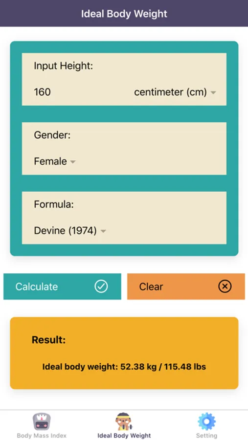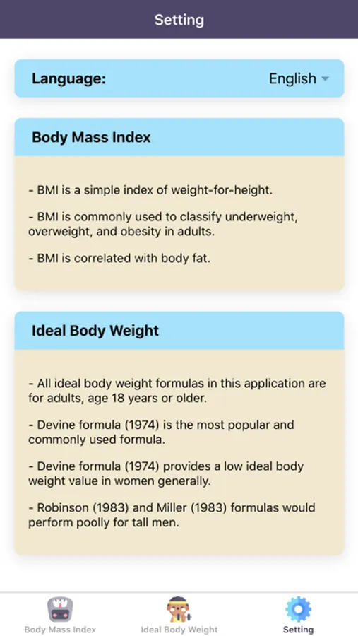 "BMI Calculator Pro: Body Mass Index & Ideal Body" will also interpret your body mass index (BMI) result. If you are underweight, then your immune system can be impaired. On the other hand, overweight or obese is highly associated with non-communicable diseases, such as hypertension, diabetes mellitus, or coronary heart disease. You can easily assess your weight calculator status with this "BMI Calculator Pro: Body Mass Index & Ideal Body" application. This app also able to determine your ideal body weight (IBW). The calculation of ideal body weight (IBW) depends on your height and gender. “BMI Calculator Pro: Body Mass Index & Ideal Body” have five most commonly used formulas to calculate ideal body weight (IBW).