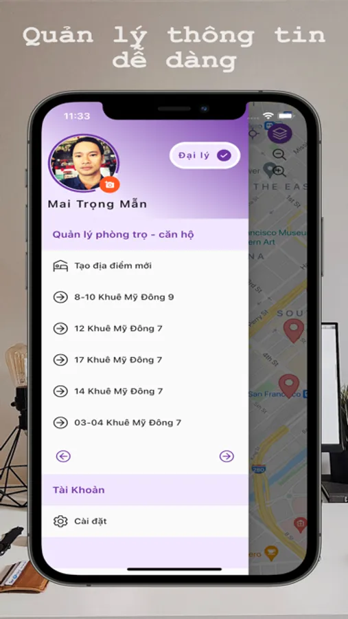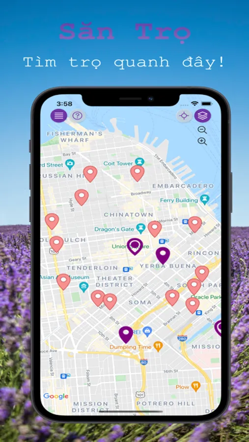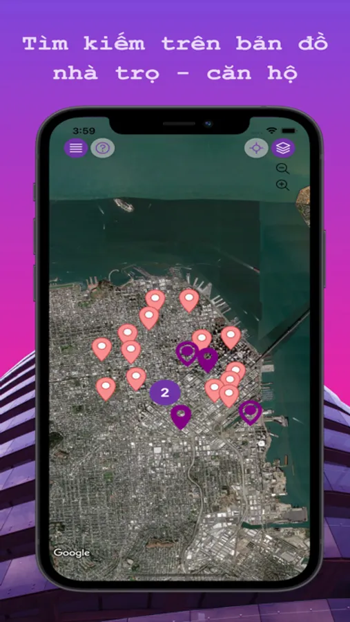 - Người dùng phần mềm có thể dựa trên bản đồ để tìm phòng trọ - căn hộ. Phần mềm dựa vào vị trí của người dùng khi dùng phần mềm để lấy địa điểm thông tin của phòng trọ - căn hộ xung quanh vị trí đang đứng và giới thiệu cho người dùng những gợi ý để thuê phòng trọ - căn hộ. Khi người dùng quan tâm, cũng có thể vào coi phòng trọ - căn hộ hiện còn trống hay đã cho thuê hết, giá tiền, hình ảnh của từng loại phòng. Và có thể gọi điện liên lạc trực tiếp thông qua phần mềm.