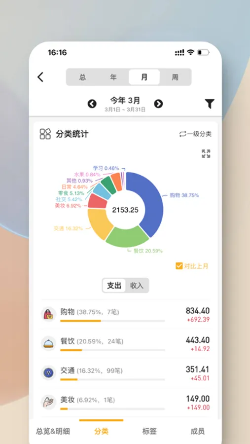 消费趋势:通过直观的图表展示,快速分析您的消费情况,方便对比上期的收入和支出。