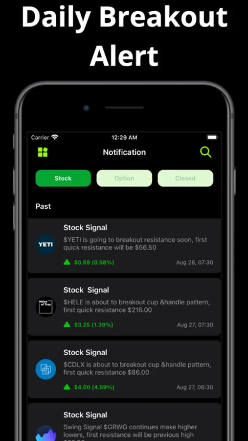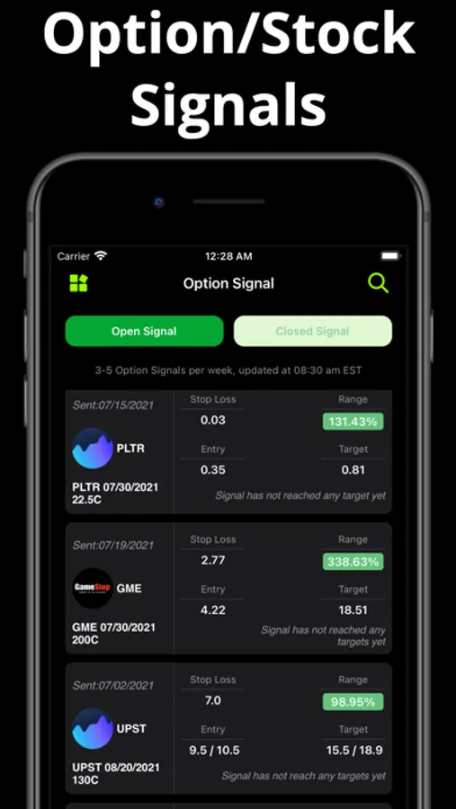 Get all the option movements and unusual flows that are occurring on options you like. Access stop loss, options profit calculator and buy & sell targets of low price high potential options, and set up relative options signals to leverage your investment. Free version will have limited number of option signal. Paid subscription is required to access all open option signal and get real time insight push.